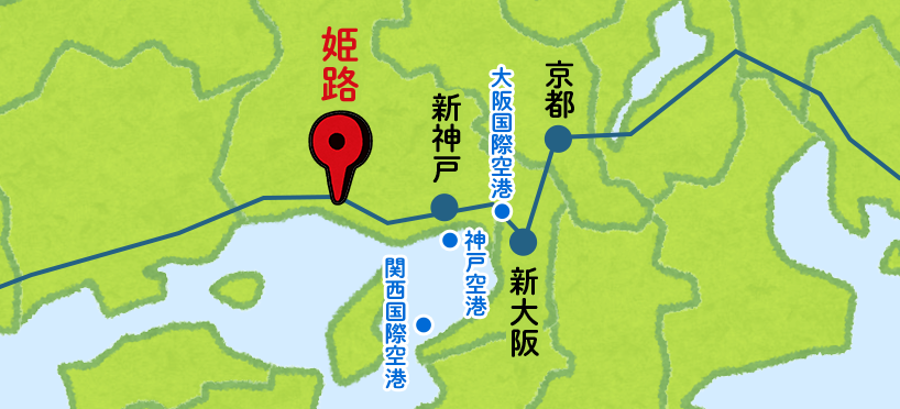 - JR姫路駅まで(新快速) 京都から約1時間25分、大阪から約57分、三ノ宮から約37分
