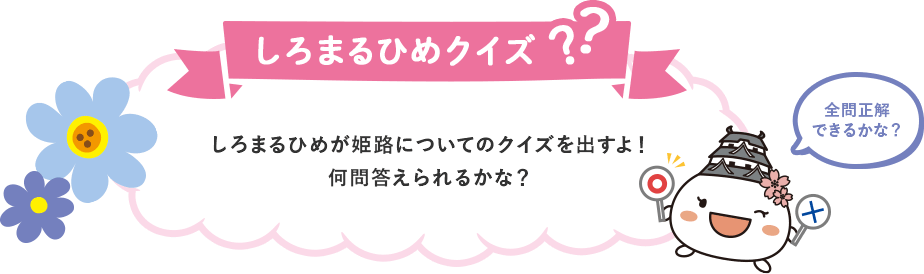トップ > しろまるひめクイズ 姫路市の隠れスポット ~その1~ 2018.04.26 更新 クイズを見る 姫路城のひみつ 〜その2〜 2018.04.26 更新 クイズを見る 姫路城のひみつ 〜その1〜 2018.04.26 更新 クイズを見る